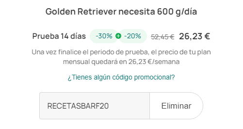 Ya sabes que el primer pedido es el de transición y antes de que pasen 2 semanas te facturarán la cuota mensual completa, este pedido puede costarte a mitad de precio, solo tienes que utilizar el código personalizado RECETASBARF20 y llevarte -20% adicional en su promo inicial.